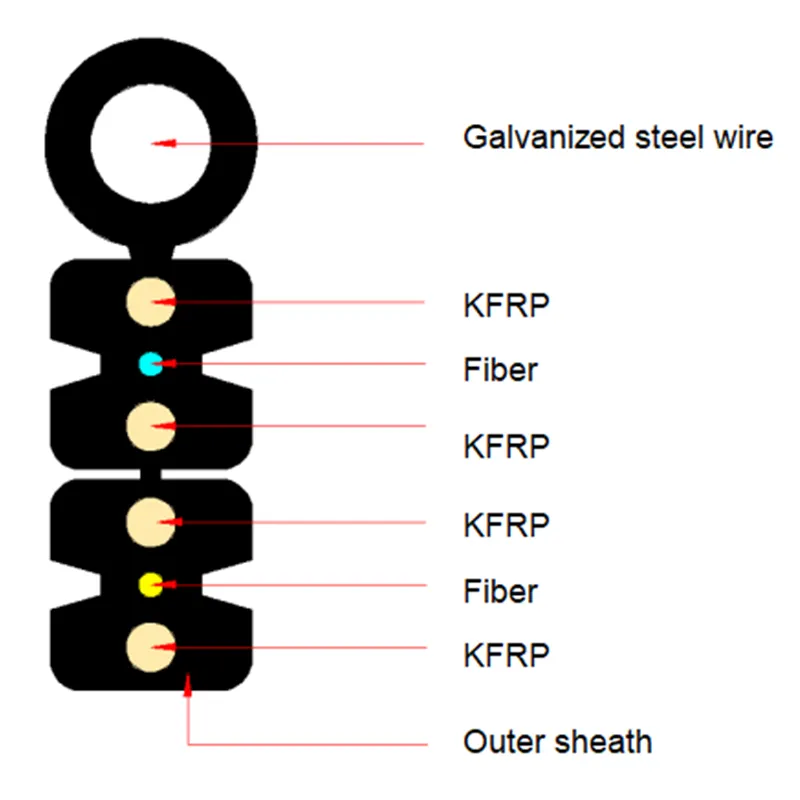 Optical fibers (2F) are positioned in the cable center,the optical cable consists of four metal or non-metal reinforcing parts, with an additional steel wire serving as a self-supporting strength component. then the cable is completed with flameproof black (or custom) color LSZH outer sheath to be a integrated product.